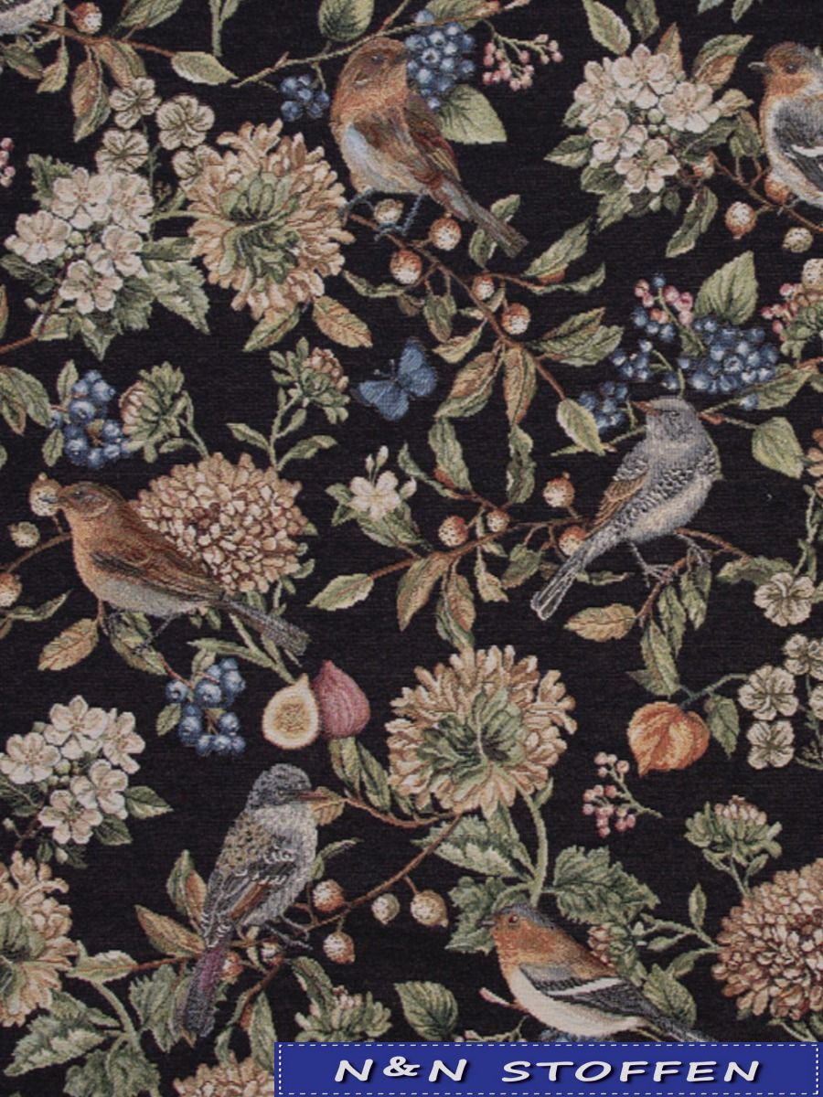 Gobelin stof Mussen en fruit zwart is een stevige stof die geschikt is voor het maken van gordijnen en het bekleden van meubels. Het rapport van deze print is 64 cm hoog.