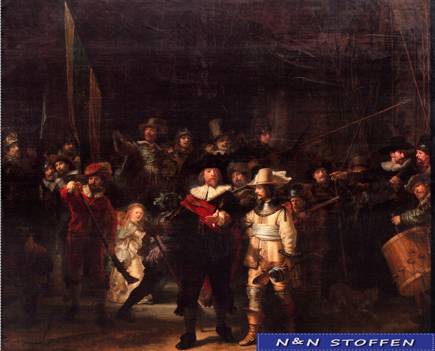 Paneelstof "de Nachtwacht" is gebaseerd op het gelijknamige schilderij van Rembrandt van Rijn. Het velours paneel is gemaakt van 100% polyester en heeft een afmeting van 120 hoog bij 140 breed. Het paneel wordt alleen per stuk verkocht. Wanneer u meerdere panelen besteld zullen deze als losse panelen geleverd worden.