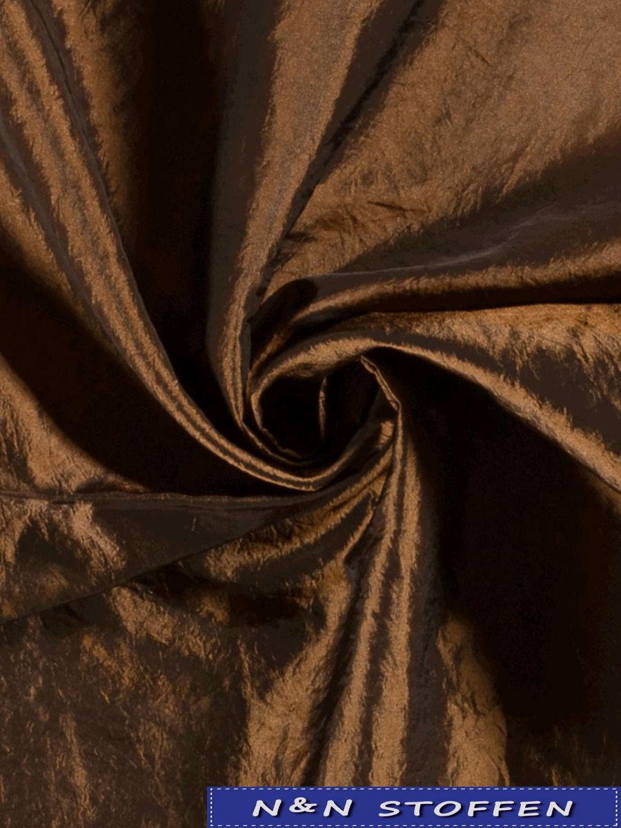 Taft bruin is een dunne glanzende stof die geschikt is voor kleding en accessoires. Het kreukeffect geeft de stof een speels uiterlijk.